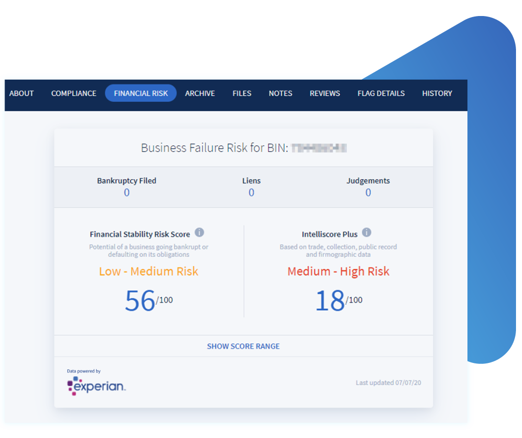 Suppliers are given a Financial Stability Risk Score (1-100) that indicates their likelihood of defaulting on financial obligations or going bankrupt.