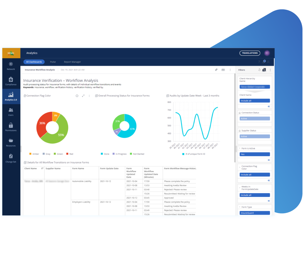 Get a complete picture of your supply chain’s insurance coverage. Quickly identify gaps and make changes to proactively mitigate risk. Clients can access this information through Analytics dashboard and reports and can filter and slice the data in many ways to evaluate and determine where there could be potential risks as well as areas of non-compliance.